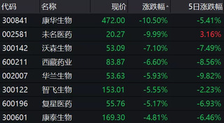 康华生物早盘大跌,带动A股整个疫苗板块下滑。当天疫苗指数下跌幅度达4.76%,其中未名医药(002581.SZ)跌停,收报20.27元;另外西藏药业下跌6.60%,华兰生物、智飞生物和复星医药的下跌幅度均超过5%。