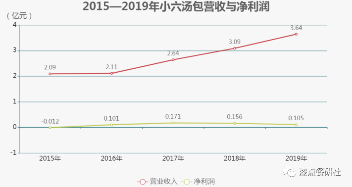 近5年来,小六汤包营收业绩从2015年2.09亿元涨到2019年3.64亿元,虽呈不断上涨的趋势,但其净利润却与营收形成反差。