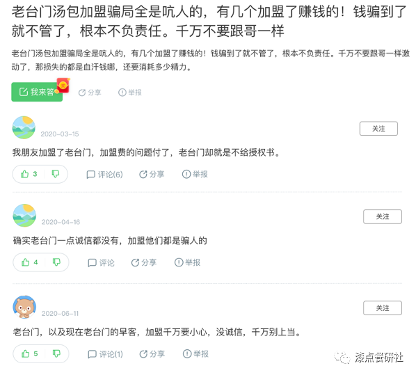一些加盟门店考虑原材成本,自行采购原料制作包点,导致产品不稳定,使得消费综合体验评价不高,变相促使品牌在加盟圈的口碑出现下滑。