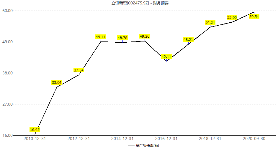 因负债上升,立讯精密三季度末的资产负债率也大幅上升至历史新高59.54%,较二季度末的54.52%增长了5.02个百分点。