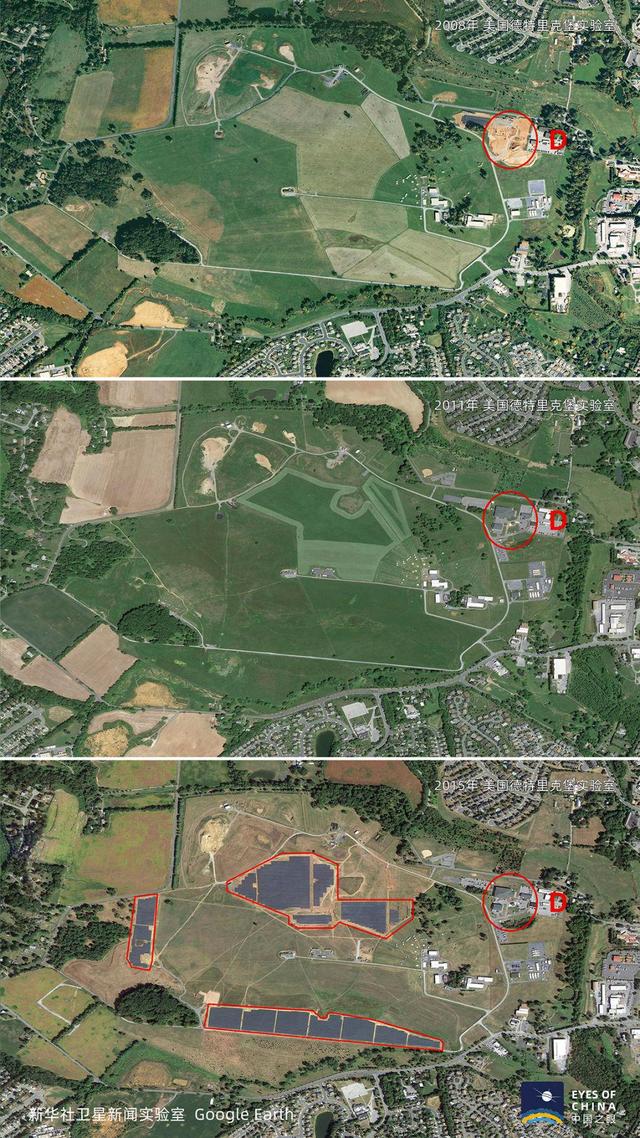 2008年开始,环场道路东北开始扩建(红圈D)。在2015年又铺设了大量太阳能板。