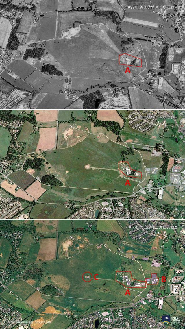 1988年至2007年,德特里克堡实验室在基地中心区进行了扩建(红圈A),并在东侧环场道路外新建了一个区域(红圈B)。