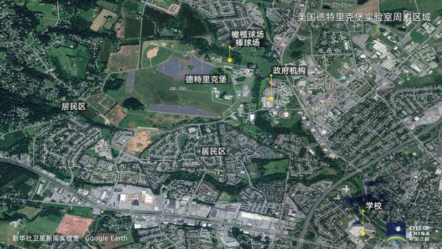 德特里克堡处于高密度生活区中,紧邻居民区。根据图上测量,实验室距离东南侧的学校直线距离约2.6公里。