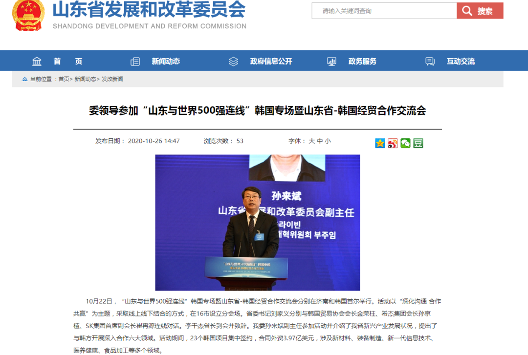 在活动现场,山东省委书记刘家义表示,山东作为中国东部沿海经济大省,一直与韩国地方保持密切的经济文化交流,我们愿与韩国各方进一步加强合作,衷心希望韩国贸易协会继续给予支持,进一步扩大双方贸易合作,推动新基建、医疗卫生、在线业务等新领域合作,组织更多企业了解山东、投资山东、创业山东。