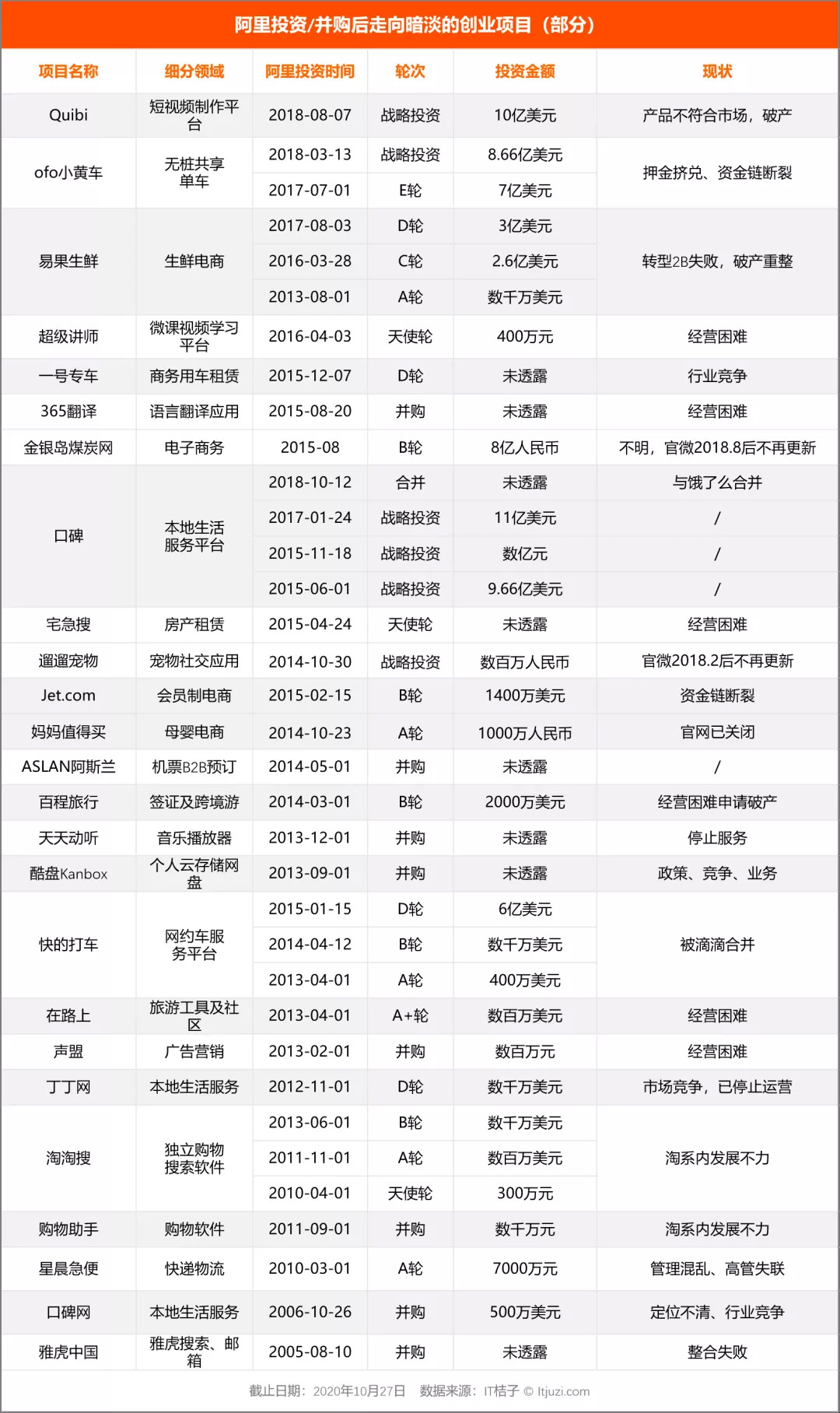 根据 IT 桔子统计,这类死亡项目近 30 个,涉及金额超 60 亿美元(注:仅计算已公开投资金额且阿里参投的轮次,部分轮次为合投)。