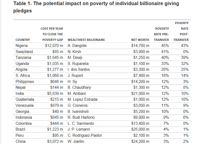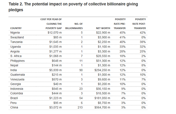 对于亿万富豪不止一个的发展中国家来讲,减贫还有另外一种选择——国内亿万富豪一同捐款。这种方式可以结束中国、印度以及印尼的贫困问题。这三个国家的绝对贫困人口数量全球排名分别是第一位、第二位和第五位。