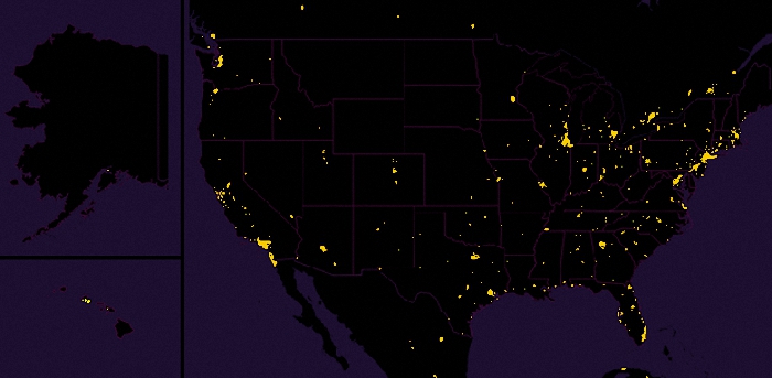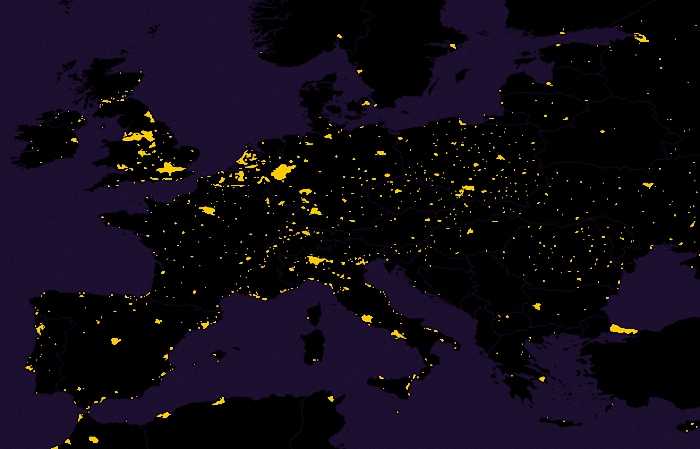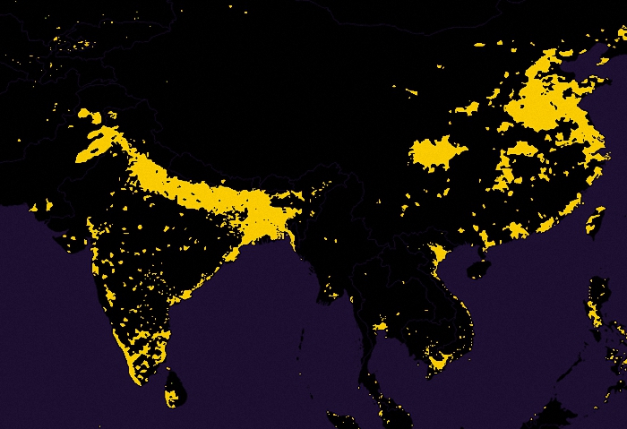 数据专家Max Galka在他所创立的数据与资料分析网站 Metrocosm上发布了这幅人口分布地图。他利用的是NASA所制的人口密度栅格数据,NASA以9平方英里(约23.31平方公里)为单位在全球范围内计算人口,而非按区、州与国家来划分。这样全球陆地就被分为了2800万个单位,若某一单位人口超过8000人,则标为黄色,反之则标为黑色。也就是说,标黄单位上的人口密度为每平方英里(约2.59平方公里)900人左右,“与美国马萨诸塞州的人口密度相当,”Galka在他的博客中这样写道。相比之下,黑色单位的人口则较为稀少。