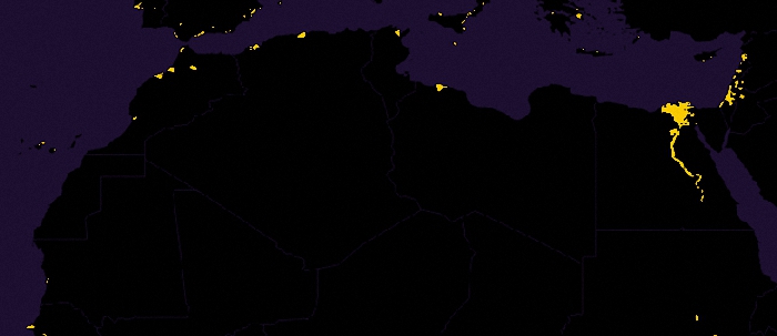 再看看北非地区,除了开罗以外几乎都是黑色,但这个小黄格可是全球人口最密的地方——小小9平方英里的土地上住着100万的人口。