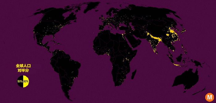 从这张地图中,我们可以看到明显的空间分布不均:全球有一半人口都挤在1%的土地上(黄色),而剩下的另一半则分散在其余99%的土地之中(黑色)。
