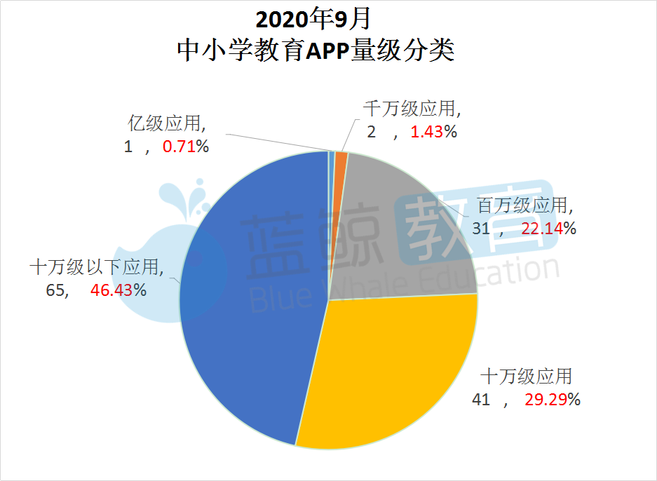 下面,蓝鲸教育智库把140家中小学教育APP,按照用户规模,分别以1亿、1000万、100万、10万为界限做量级分类,得到的结果如下图所示: