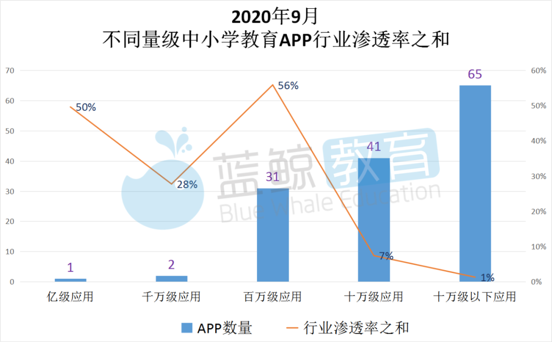 亿级规模应用“作业帮”,领域渗透率占据中小学教育的半壁江山,高达50%;2家千万级应用:“一起小学学生”“小猿搜题”,它们的领域渗透率之和为28%;31家百万级用户规模APP,用户渗透率也过半,有56%;而十万级应用和十万级以下应用的领域渗透率之和则不足10%,分别为7%与1%。