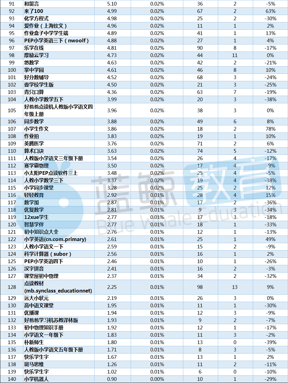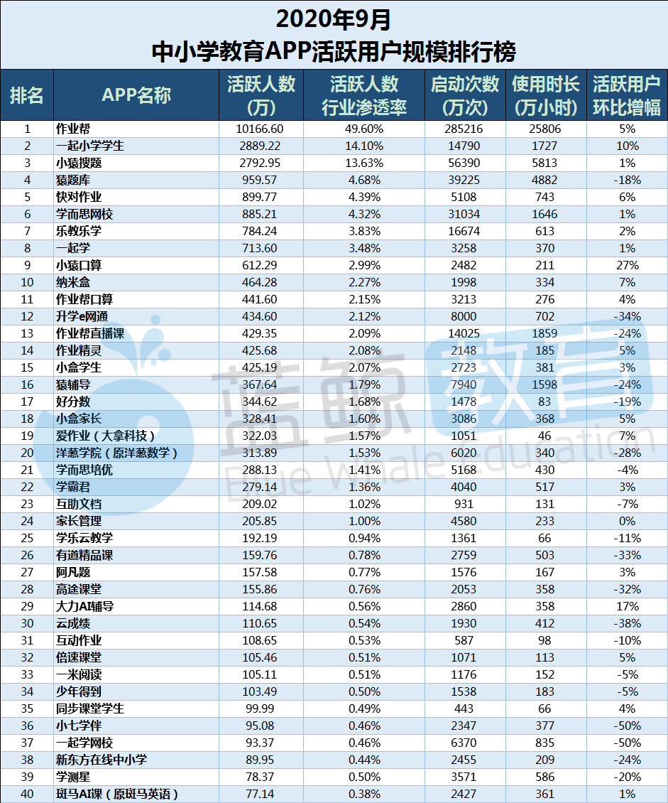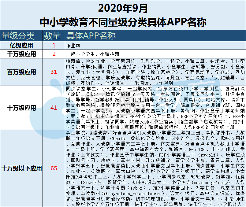下面是2020年9月末140家中小学教育活跃APP的详细排名,排名按照用户规模,包括活跃人数、启动次数及使用时长等维度数据,供大家查阅: