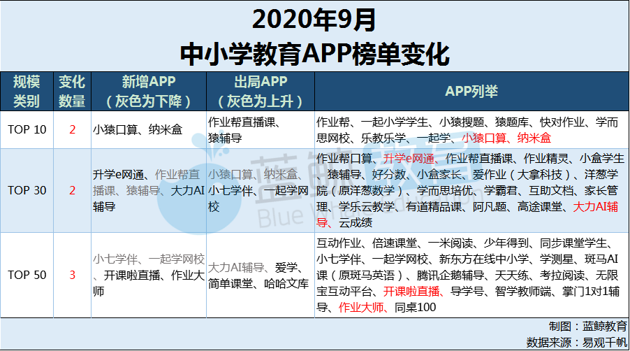为了更好的梳理9月末外语学习赛道具体的APP数据变化,蓝鲸教育智库选取了2020年8月末到9月末,中小学教育APP的具体榜单变化,下图是“2020年9月中小学教育APP榜单变化”:标灰色的APP表示从上一级别甩出到下一级别或者从下一级别进入上一级别,并不算作该级别新增APP;标红的为9月各大TOP排行榜等级上升的APP: