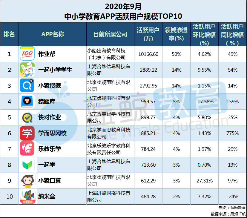 我们再来看看中小学教育领域用户增长幅度TOP 10的APP,2020年9月末活跃用户环比增幅TOP 10榜单如下: