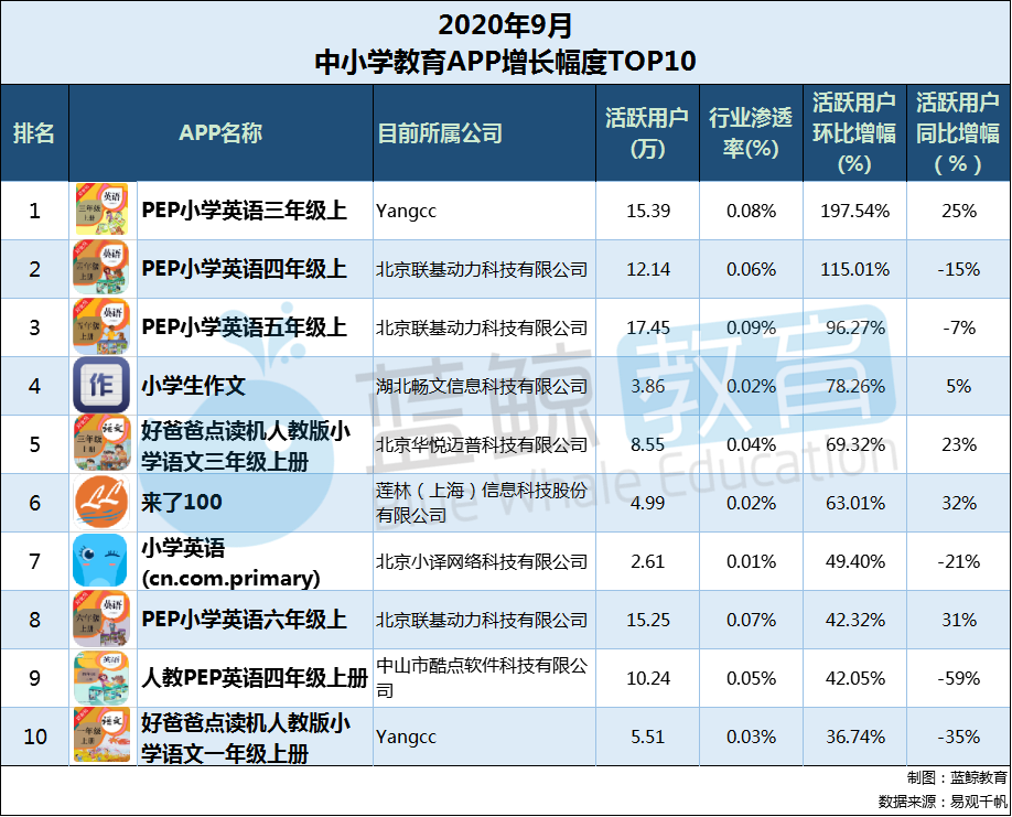 2020年9月末用户增速前十的APP分别是:“PEP小学英语三年级上”“PEP小学英语四年级上”“PEP小学英语五年级上”“小学生作文”“好爸爸点读机人教版小学语文三年级上册”“来了100”“小学英语(cn.com.primary)”“PEP小学英语六年级上”“人教PEP英语四年级上册”“好爸爸点读机人教版小学语文一年级上册”。