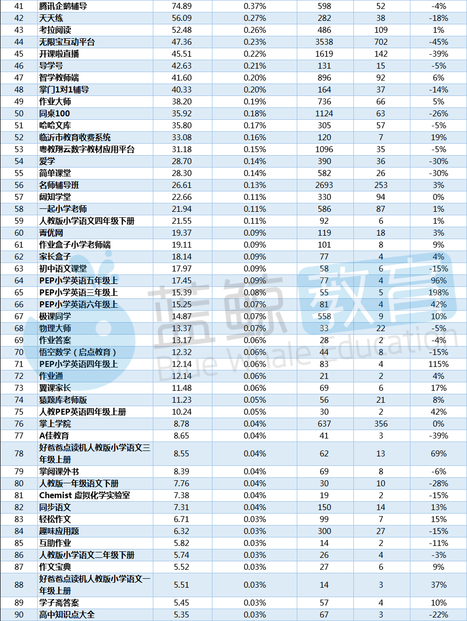 用户规模下跌比较明显的APP有:“小七学伴”用户规模较8月环比下降50%,“一起学网校”下降50%,“无限宝互动平台”下降45%,“A佳教育”下降39%,“朴新师生”下降39%,“开课啦直播”下降39%……也有多个百万级的应用降幅较大:“云成绩”下跌38%,“升学e网通”下跌34%,“有道精品课”下跌33%,“高途课堂”下跌32%……