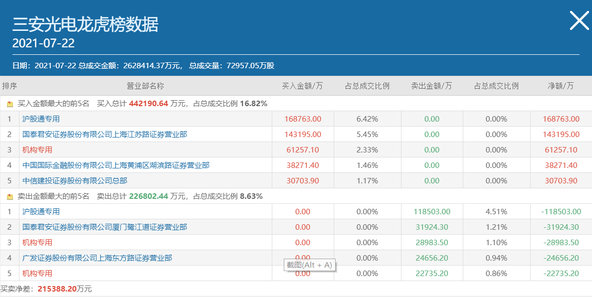 另外,从三安光电7月22日披露的3日龙虎榜单上看,北上资金和机构资金虽然都是有买有卖,但整体上也都呈现净流入状态。
