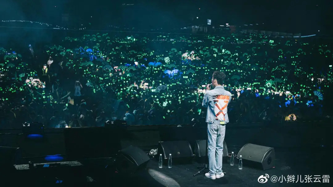 (10月初,张云雷出现在上海国潮音乐节的舞台,掀起台下一阵“绿海”,观众大部分都是带着“雷”字或是折扇形状灯牌的德云女孩们)