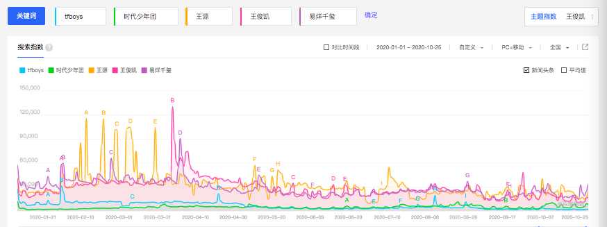(2020年,王源、王俊凯、易烊千玺、TFBOYS、TNT百度指数)