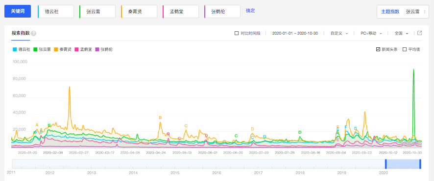 (2020年,德云社、张云雷、秦霄贤、孟鹤堂、张鹤伦百度指数)