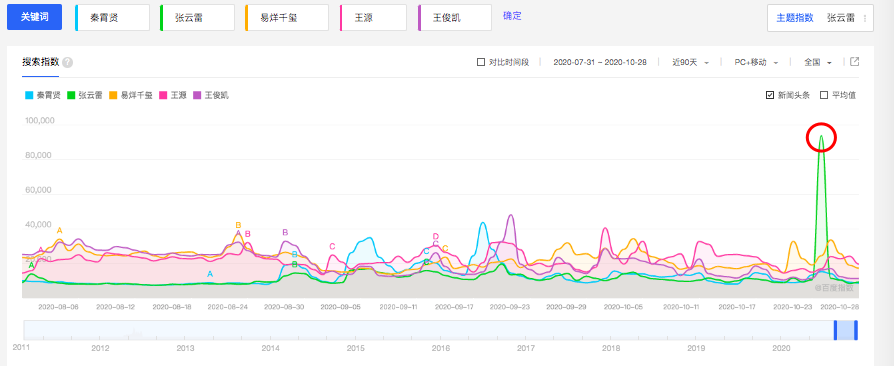 值得注意的是,在最近一季度(8-10月),五人百度指数的制高点是张云雷创造的。那天,他发布了新EP《牵挂》,开售2分钟即达成销售额500万,成为QQ音乐2020年最快突破“三白金唱片”、“钻石唱片”两项等级认证的EP。相声演员跨界歌手,并没有想象中难。