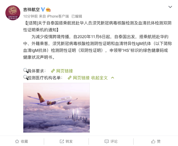 据@吉祥航空 微博2日消息,吉祥航空发布关于自泰国搭乘航班赴华人员须凭新冠病毒核酸检测及血清抗体检测双阴性证明乘机的通知。通知称,为减少疫情跨境传播,自2020年11月6日起,自泰国出发,搭乘航班赴华的中、外籍乘客,须凭新冠病毒核酸检测阴性证明和血清特异性IgM抗体(以下简称血清IgM抗体)检测阴性证明(双阴性证明),申领带“HS”标识的绿色健康码或健康状况声明书。