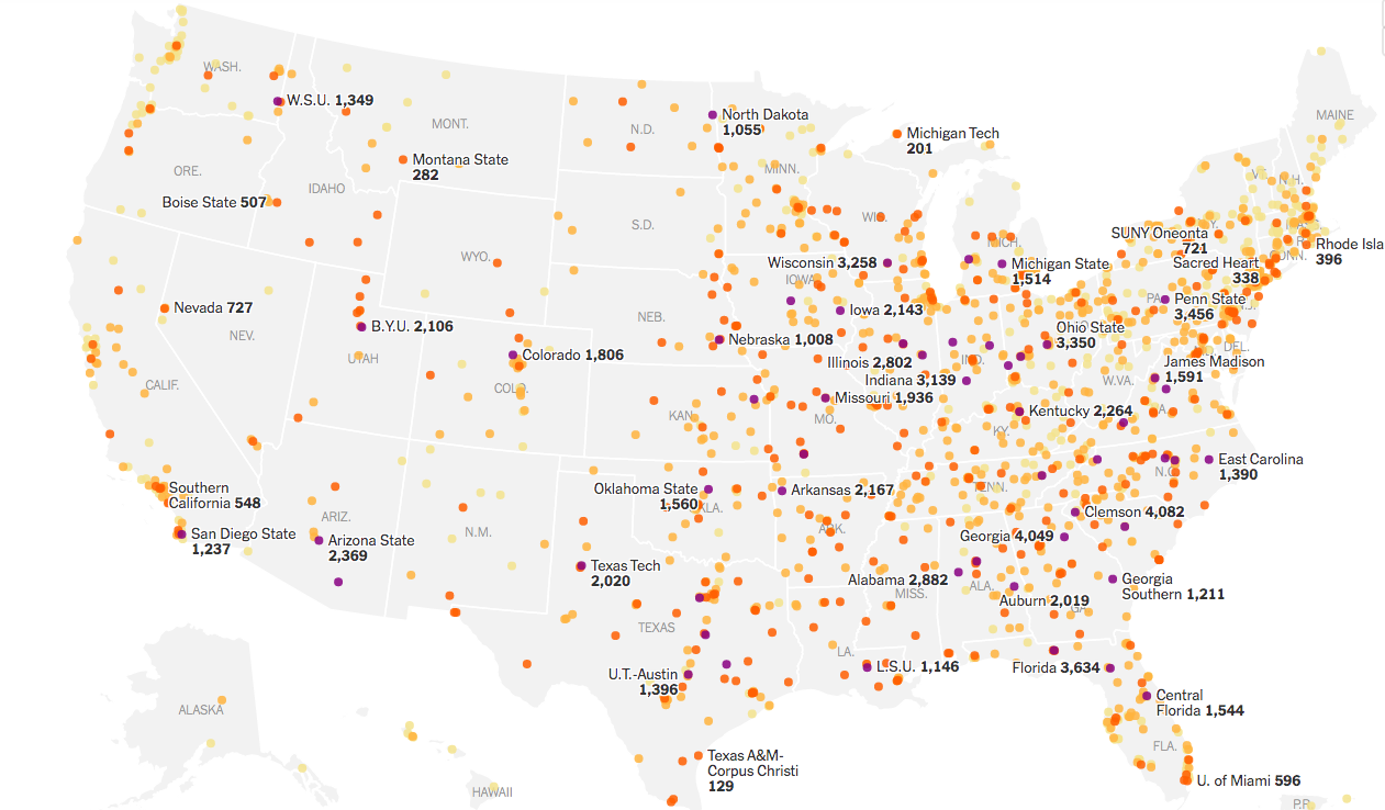 △截止到10月22日,美国各大院校新冠病毒感染数据 (图片来源:《纽约时报》)