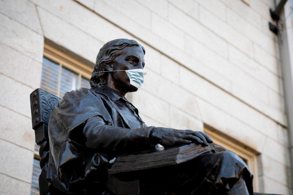 △戴口罩的哈佛铜像 ( 图片来源:学校官网)