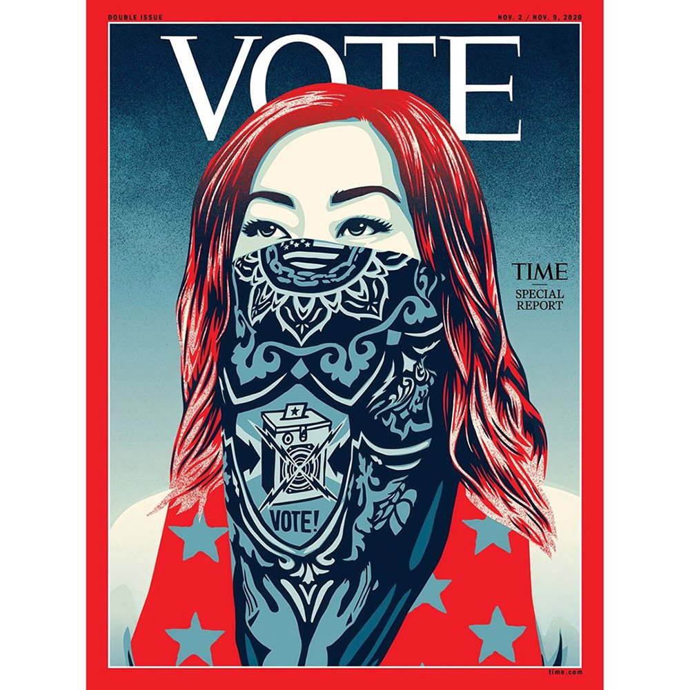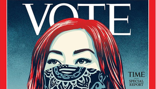 由艺术家 Shepard fairey 设计的投票封面描绘了一位与美国国旗颜色相同的蒙面女子,她的头巾上印着一个投票箱。《时代》杂志主编兼首席执行官 Edward Felsenthal 解释说,这一年因新冠肺炎疫情全球大流行,充满了痛苦、混乱和损失。但现在,全球经济正在回暖,世界各国以不同的方式重建世界。美国人也在思考:怎样才能抓住这个机会,推动一个更健康、更有韧性、更可持续、更公正的世界?而不是简单地回到过去。