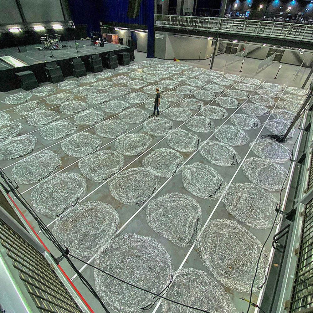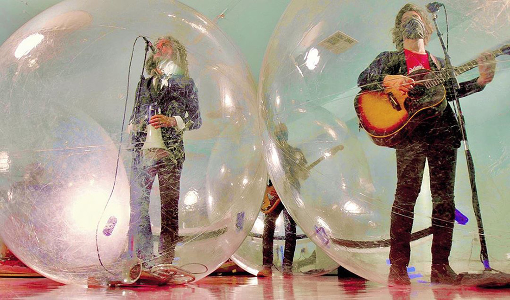 上个月,烈焰红唇乐队在他们的家乡俄克拉荷马城举行了一场特殊的演唱会。乐队把他们自己和所有的观众都装在一个个塑料泡泡里。这个会场通常能容纳3500人,但这次却装了100个泡泡,可容纳100人。
