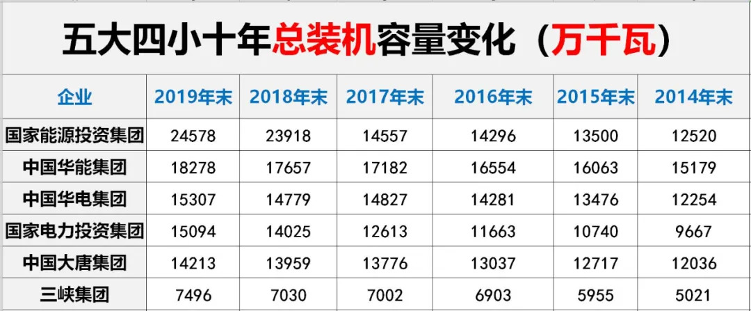 本文分为两大部分:第一部分,“五大四小”2010年——2019年总装机与各类机组装机的综合对比;第二大部分,“五大四小”2010年——2019年单体各自不同机组装机的呈现和对比。