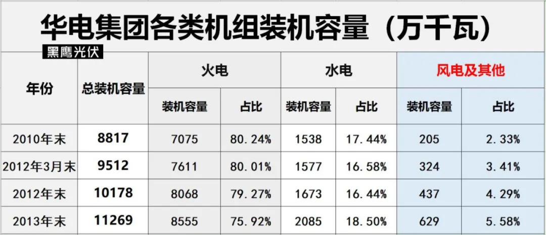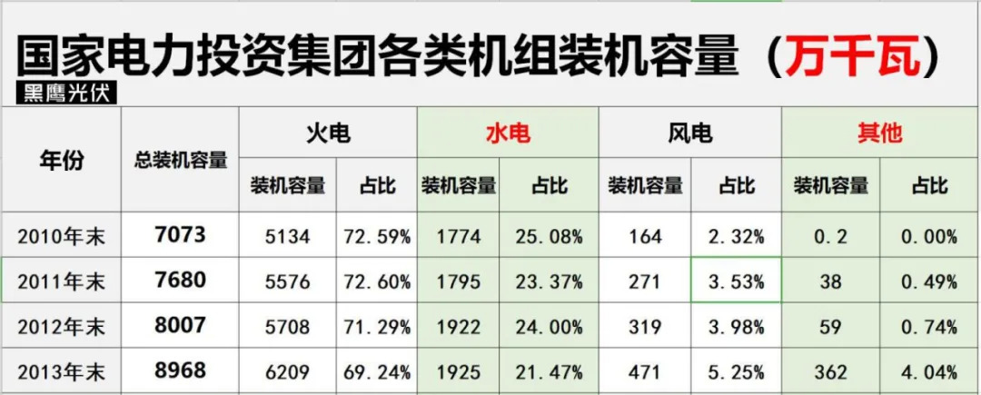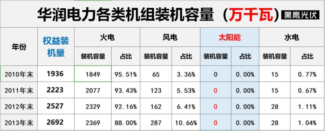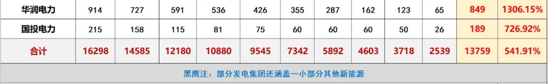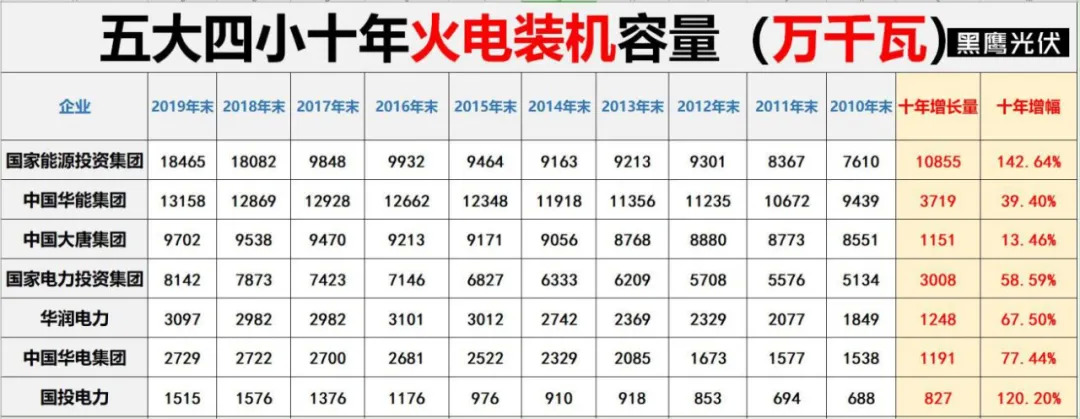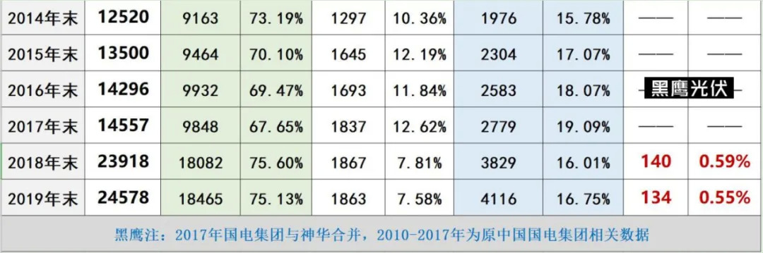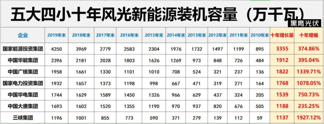 黑鹰光伏特别注:基于电力央企整合重组的变化,本文表格中,国家能源集团2010-2017年数据为原中国国电集团数据,2018-2019年为原中国国电集团与神华集团合并后数据;中国广核集团2011年-2016年风电和太阳能数据分别为2011年11月末、2012年9月末、2014年3月末、2015年3月末、2016年3月末、2016年9月末数据。除华润电力装机容量为权益装机容量外,其他发电集团均是控股装机容量。