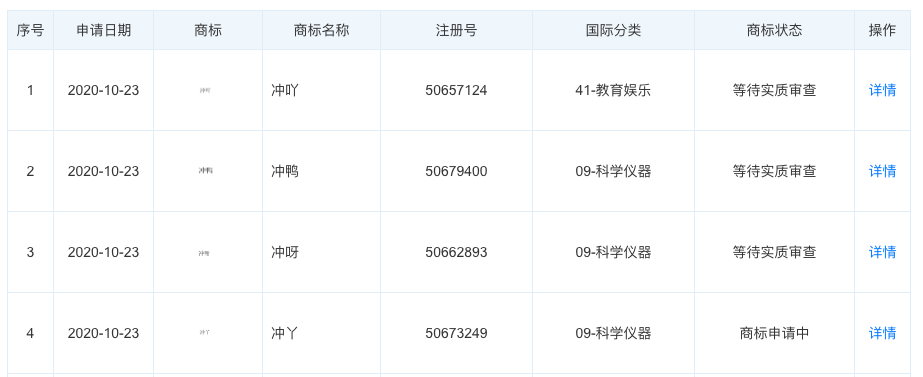 据天眼查APP显示,近日,广州酷狗计算机科技有限公司新增多条商标信息,商标名称包含“冲吖”、“冲鸭”、“冲呀”、“冲丫”,申请日期均为10月23日,国际分类涉及教育娱乐、科学仪器,商标状态为等待实质审查和商标申请中。