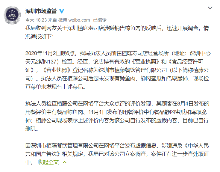据@深圳市场监管 微博11月3日消息,近日,深圳市市场监督管理局收到网友关于深圳植庭寿司店涉嫌销售鲸鱼肉的反映后,迅速开展调查。情况通报如下: