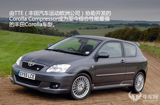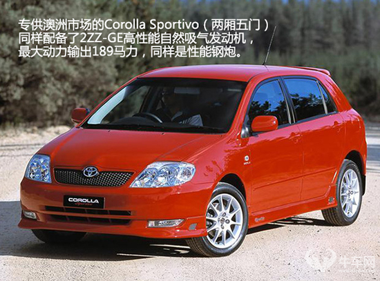 针对澳洲市场开发的Corolla Sportivo和针对欧洲市场开发的Corolla TS,和Corolla Fielder Z Aero Tourer的区别只是动力输出略有不同。而2005年由TTE协助开发的欧规三门两厢版Corolla Compressor,其配备的2ZZ-GE发动机增加了机械增压器,最大动力输出因此提高到了222马力,0-100公里/小时加速用时仅6.9秒。