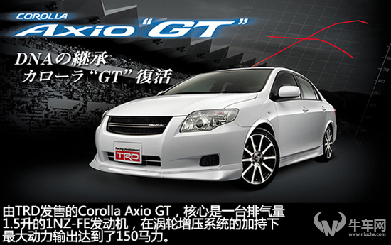 在国内市场改名为卡罗拉之后,第十代Corolla仅在日本和美国市场保留着“高性能”版本。前者称为Corolla Axio GT,于2009年2月正式对外销售,此车装备一台由TRD开发的涡轮增压版1.5升1NZ-FE发动机,最大动力输出可达150马力。外观部分包括由TRD量身订做的水箱进气格栅,前、后扰流板,侧裙。TRD Sportivo高性能减震器、TRD TF4 17寸运动型轮毂、米其林215/45 R17轮胎、强化离合器、高性能刹车片则保证其拥有比较理想的运动性能。