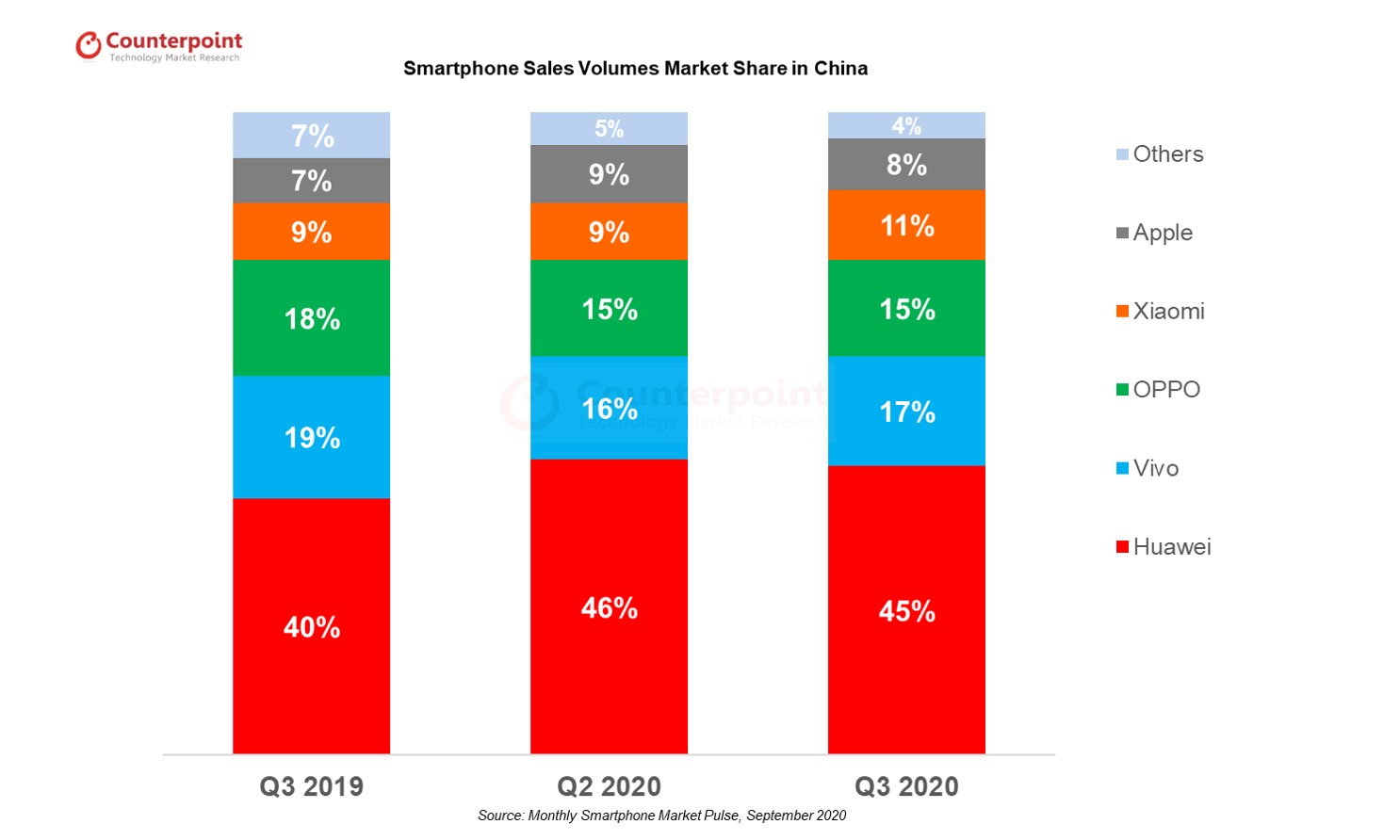 以三星为例,在今年的第二季度,其在韩国本土的智能手机市场竟然达到接近70%的市场份额。相比之下,据Counterpoint的统计,今年第三季度,华为在中国手机市场的份额为45%,加上华为因为市场和非市场因素叠加获得的在中国市场的品牌影响和号召力,理应具备较大的增长空间。