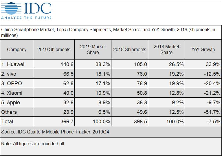 这里我们发现一个有意思的现象,在今年前三个季度,紧随华为之后的中国手机厂商小米、OV在前两个季度(即华为手机同比增长的季度)均呈现出双位数的下滑,到了第三季度,OV依然呈现双位数的下滑,华为意外加入了下滑的行列。