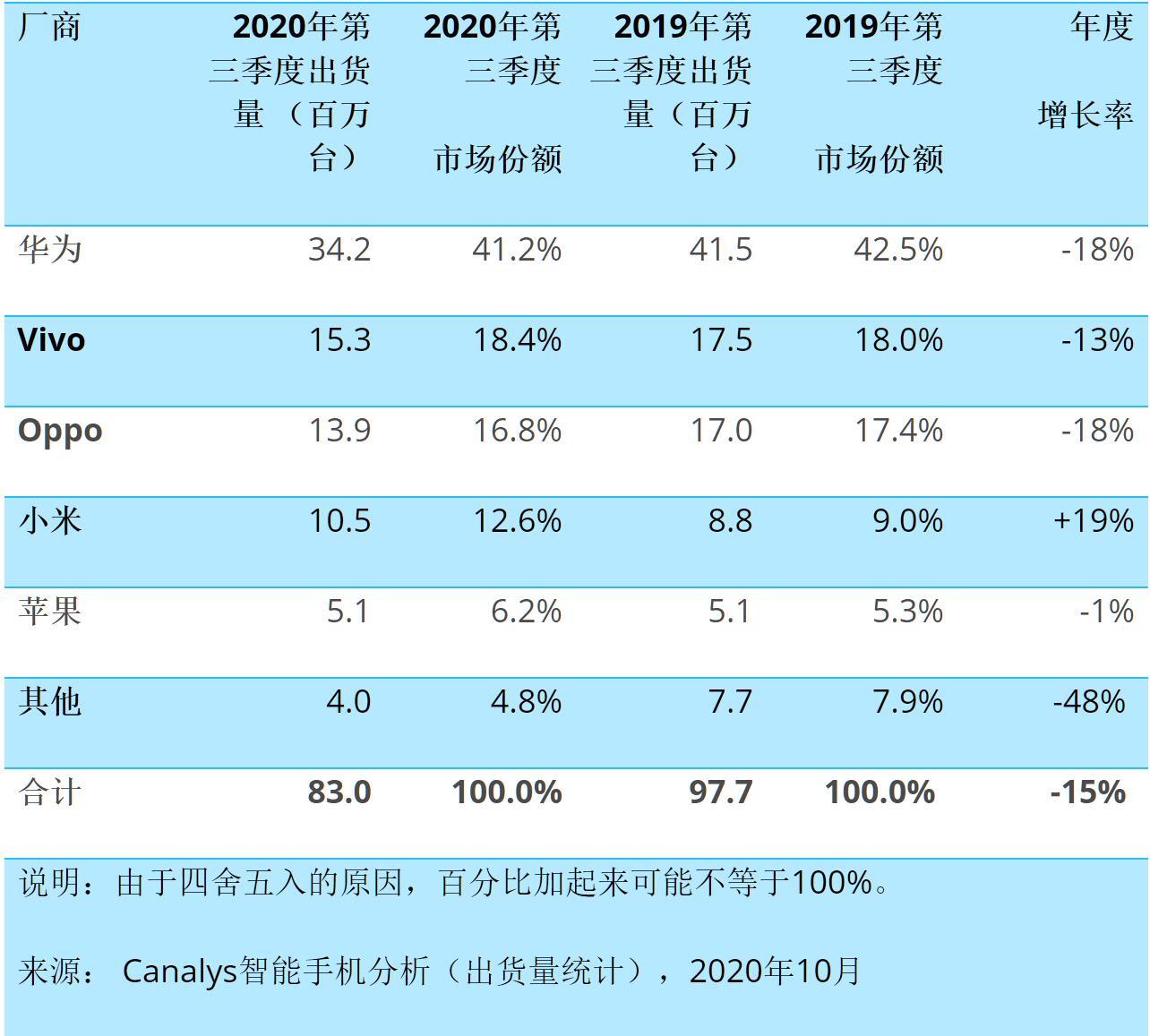 为了进一步佐证华为手机暴跌的意外,我们此处再引用CINNO Research月度国内手机销量监测数据予以说明。该销量监测报告显示,2020年第三季度中国智能机市场,华为(含荣耀)智能手机销量同比下降29%,与此同时,vivo(含IQOO)、OPPO智能手机销量分别同比分别下降21%、20%,华为手机的降幅甚至超过了OV。