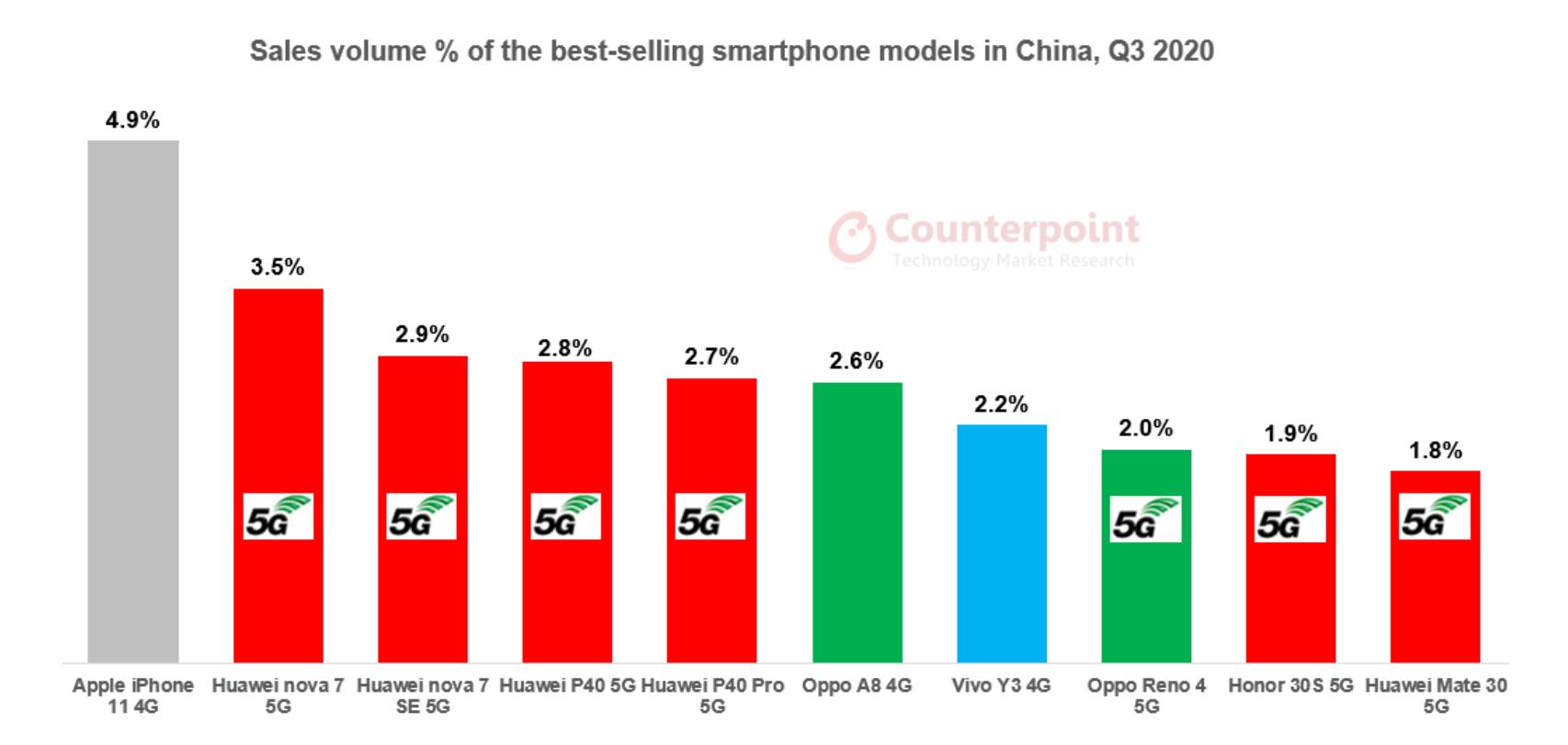 据Counterpoint的统计,在第三季度中国智能手机市场销量TOP10的排名中,华为竟然占据了6席,而且全部是中高端的5G机型。