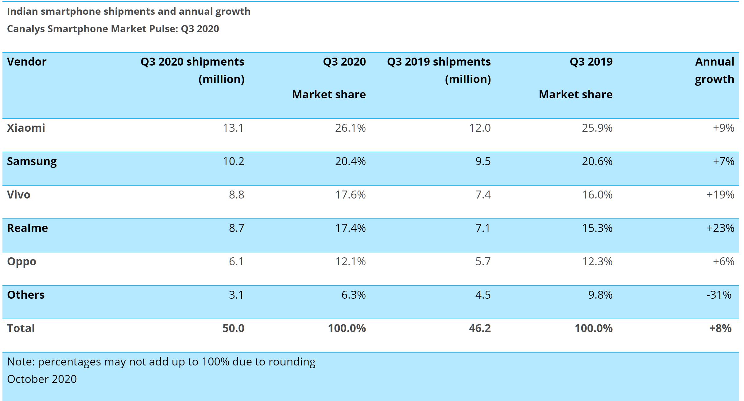 例如OPPO从2019年第一季度到2020年第二季度,OPPO在国内市场的出货量已经连续六个季度同比下滑。但意外的是,据Canalys的统计,在刚刚过去的第三季度,OPPO依然是“平稳”地同比下滑了18%,vivo的表现也没有好到哪里去,同比下滑13%。这与小米逆势大增19%形成了强烈的反差。