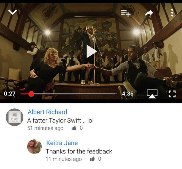 “我的朋友们不断给我发这些评论,而我觉得这些评论并不恰当,”比如,“大版/大胸版泰勒”,Keitra告诉Seventeen.com,“有一条评论引起了我注意。它写道:‘一个肥版泰勒·斯威夫特︐。”