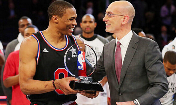 4. 拉塞尔·韦斯布鲁克 韦少本赛季的PER值达到了28.6,排在联盟第三,而他的队友杜兰特以29.5的PER值排在联盟第二。在过去五十年中,只有2010-2011赛季、2011-2012赛季的勒布朗·詹姆斯和德怀恩·韦德曾在单赛季共同进入了PER值排行榜的前三位。 在2015年的全明星赛中,韦斯布鲁克狂砍41分,距张伯伦保持的42分的全明星赛记录仅有一步之遥。
