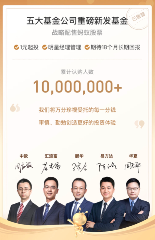 此次参与蚂蚁战略配售基金有5只,分别是华夏、易方达、鹏华、汇添富、中欧,每只基金最低1元起购,最高可认购10%蚂蚁股票,封闭期18个月期。