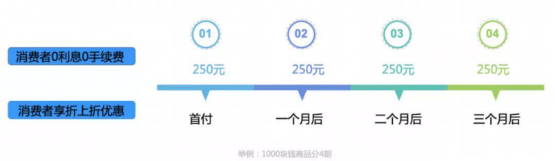 对于消费者来说,首期只需支付商品价格的1/4,且无需支付利息和手续费,从而减轻了现金流压力;对入驻的商家来说,可以全额收取用户所支付的商品款项,而用户再向平台进行分期付款。