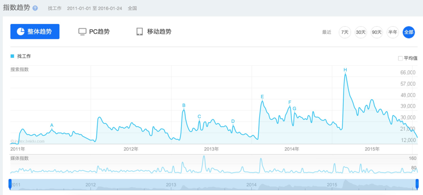 第一幅图是关于“年终奖”的百度搜索指数,第二幅图是“找工作”的百度指数,有趣的是这二者都通常在年底的1月低和2月初到达高峰。