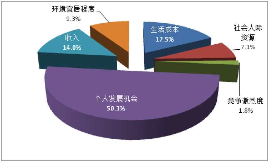 以上是北京青年压力管理服务中心联合腾讯教育共同发布的《2015年中国大学生就业压力调查报告》,这张图是关于大学生选择工作地点的考虑,半数的人(50.3%)将个人发展机会作为了首要选择标准。可见对于面临就业的学生而言,发展前景是首要考虑因素,然后是生活成本与收入以及宜居程度(分别为17.5%、14.0%、9.3%)。