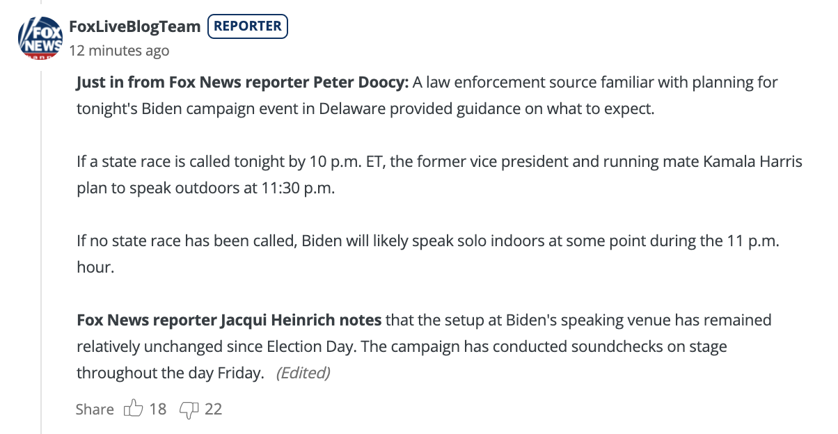 如果选举结果未更新,拜登会在美东时间晚上11点左右(北京时间7日12时)在室内单独发言。