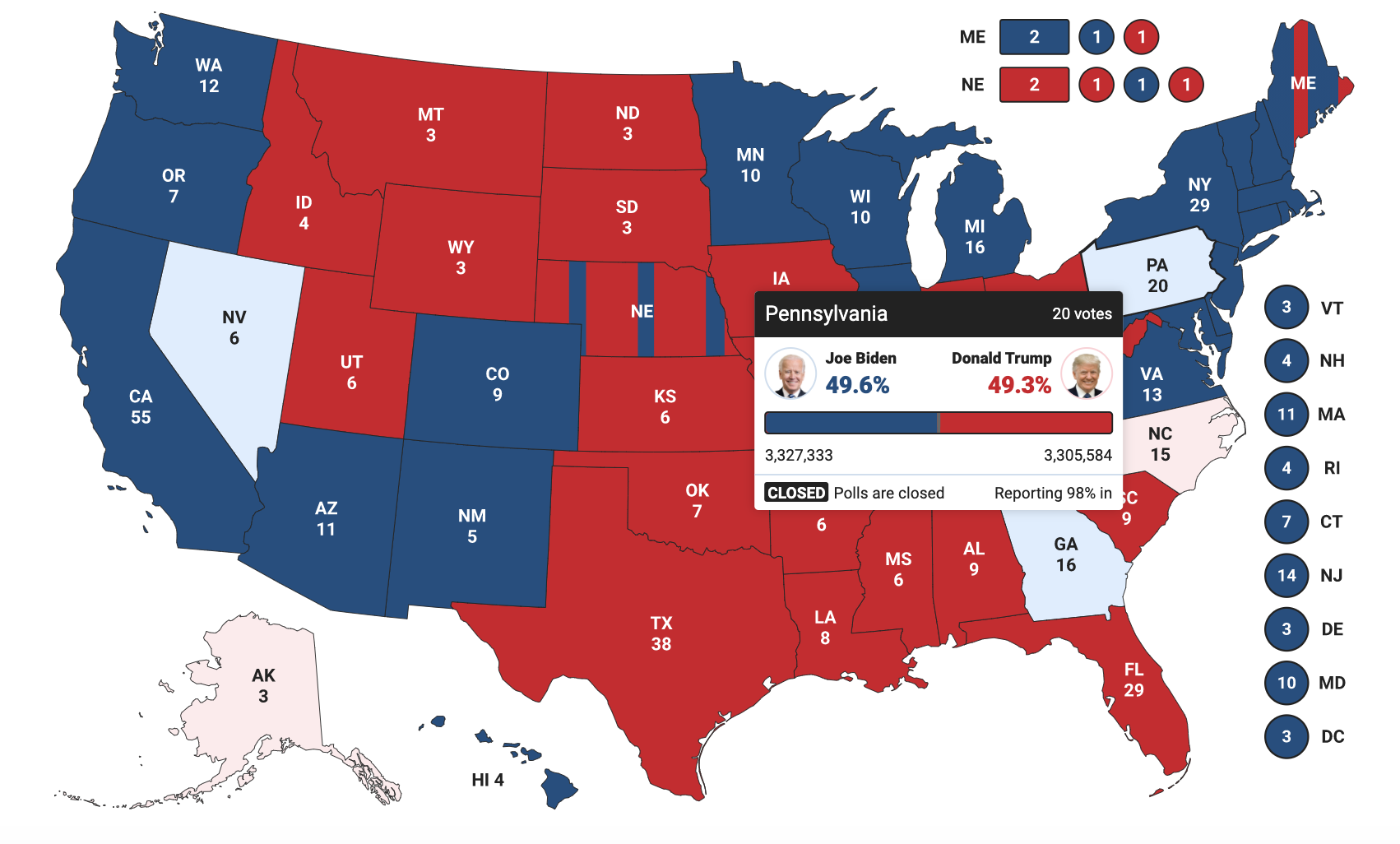 目前,特朗普获得214张选举人票,拜登获得264张。首先获得538张选举人票中270张的候选人将赢得大选。截至发稿,还有阿拉斯加州(3张)、内华达州(6张)、佐治亚州(16张)、北卡罗来纳州(15张)、宾夕法尼亚州(20张)等5个州未出结果。拜登在内华达州、佐治亚州、宾夕法尼亚州暂时领先。