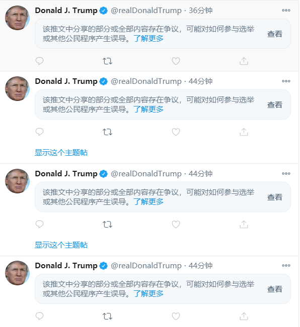推特给出的提示称:“该推文中分享的部分或全部内容存在争议,可能对如何参与选举或其他公民程序产生误导。”